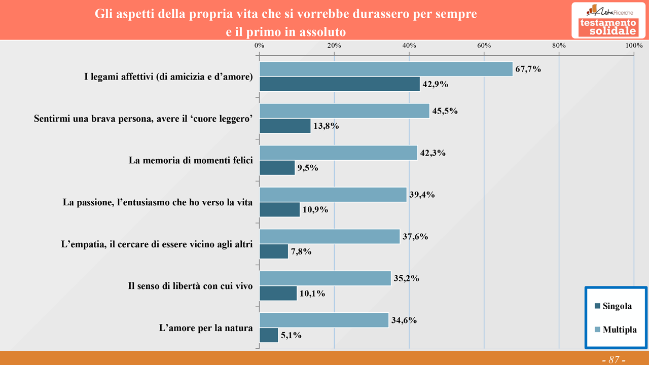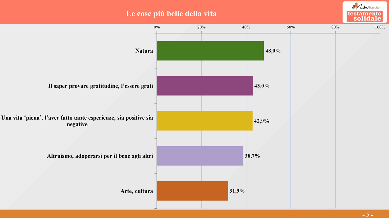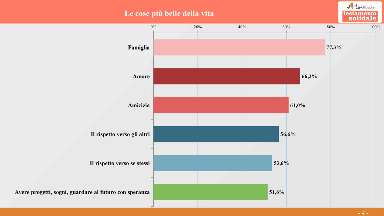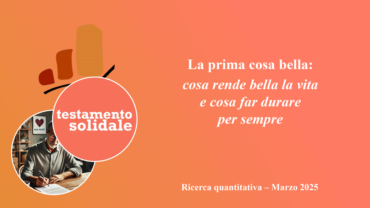 In occasione del lancio della sua nuova campagna “Lascia che le cose belle continuino per sempre”, il Comitato Testamento Solidale diffonde i risultati della ricerca “La prima cosa bella: cosa rende bella la vita e cosa far durare per sempre”, condotta da AstraRicerche alla fine di marzo. Ne emerge la fotografia di un Italia che sogna un futuro di pace per tutti e di legami familiari, disponibile a lasciare traccia di sé non solo attraverso oggetti “della memoria”, come foto e lettere, ma anche attraverso un lascito solidale.