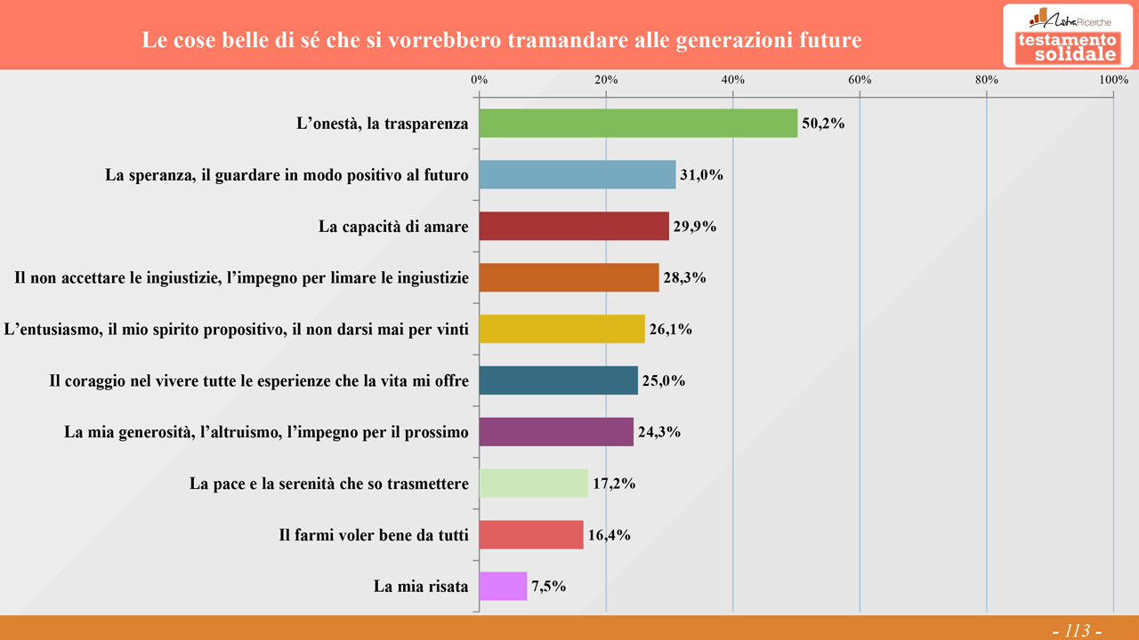 Guardando alle cose belle di sé che si vorrebbero tramandare alle generazioni future, l’onestà, la trasparenza (50.2%) dominano nettamente la classifica, seguite a grande distanza dalla speranza, la capacità di guardare in modo positivo al futuro (31.0%). La generosità, l’altruismo, l’impegno per il prossimo si attestano al 24,3%. A livello geografico sono da evidenziare il non accettare le ingiustizie nel Nord-ovest (32%) e la generosità, l’altruismo nel Sud (28%).