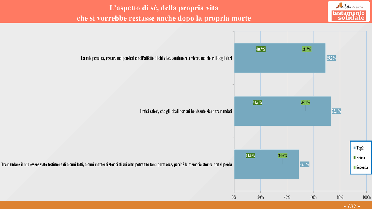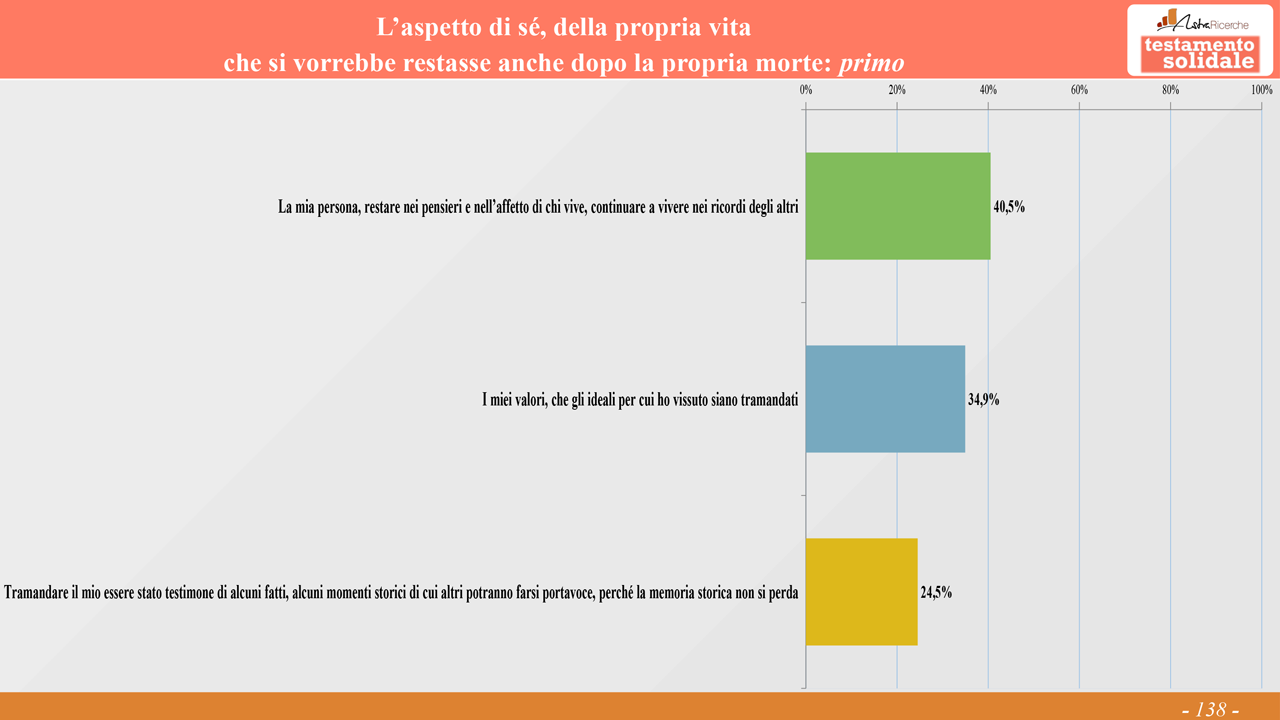 Indagando sull’aspetto di sé che si vorrebbe restasse anche dopo la propria morte, il 40.5% indica il continuare a vivere nel ricordo degli altri (donne 46%, 55-70enni: 43%). Il 35% sceglie i propri valori, gli ideali per cui ha vissuto (55-70enni: 39%). Il 24.5% indica, invece, il tramandare la memoria storica personale, i fatti e i momenti storici di cui è stato testimone (uomini 28%, 25-34enni 33% – molto interessante visto che è la generazione che per motivi anagrafici ha una memoria storica quantitativamente minore).