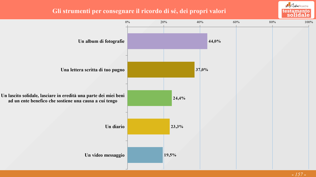 Tra gli oggetti, vince nettamente l’album di fotografie (44.0%), poi una lettera scritta di proprio pugno (37.0%), un diario (23.3% – ma è ben il 33% presso i 25-34enni), un video messaggio (19.5%).