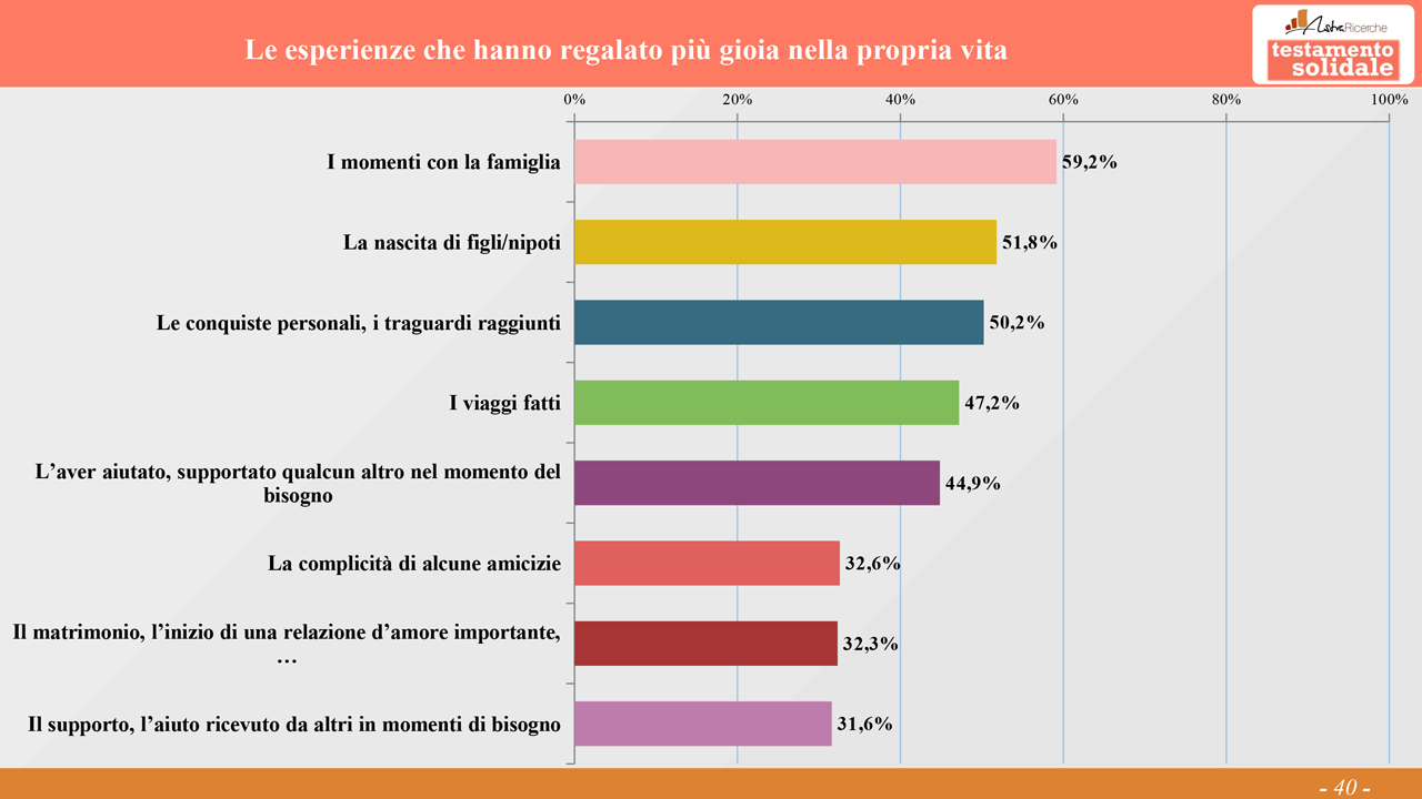 Spostandoci sul piano prettamente personale, sulle esperienze più appaganti nella propria vita, sul podio troviamo i momenti con la famiglia (59.2%), poi la nascita di figli o nipoti (51.8%) e soltanto al terzo posto i traguardi personali (50.2%). L’amore e le amicizie sono indicati molto meno della famiglia, entrambi poco sopra il 32%. I momenti con la famiglia sono maggiormente indicati nel Centro e nel Sud del Paese, mentre i traguardi personali sono sopra media nel Nord-Est. Notevole la percentuale di chi ritiene che fra le esperienze che hanno regalato più gioia nella propria vita ci sia l’aver dato supporto a qualcuno nel momento del bisogno, dato che supera nettamente quello dall’averlo ricevuto (44.9% vs 31.6%).