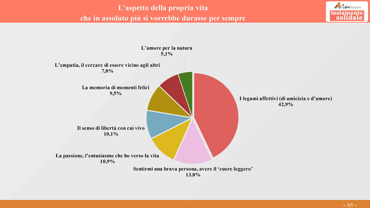 Quali sono gli aspetti della propria vita che si vorrebbe durassero per sempre? I legami affettivi, quelli di amicizia e d’amore, ottengono il 67.7% delle indicazioni, seguiti – a grande distanza – dal sentirsi una brava persona con il 45.5%. I legami affettivi crescono dal 58% nei 25-34enni fino al 72% nei 55-70enni; anche il sentirsi una brava persona cresce raggiungendo il suo massimo presso i 55-70enni (51%); come l’amore per la natura, che ha il suo picco presso i 55-70enni (41%). Al contrario, l’empatia, il cercare di essere vicino agli altri mostra il suo massimo valore presso i 25-34enni (46%).