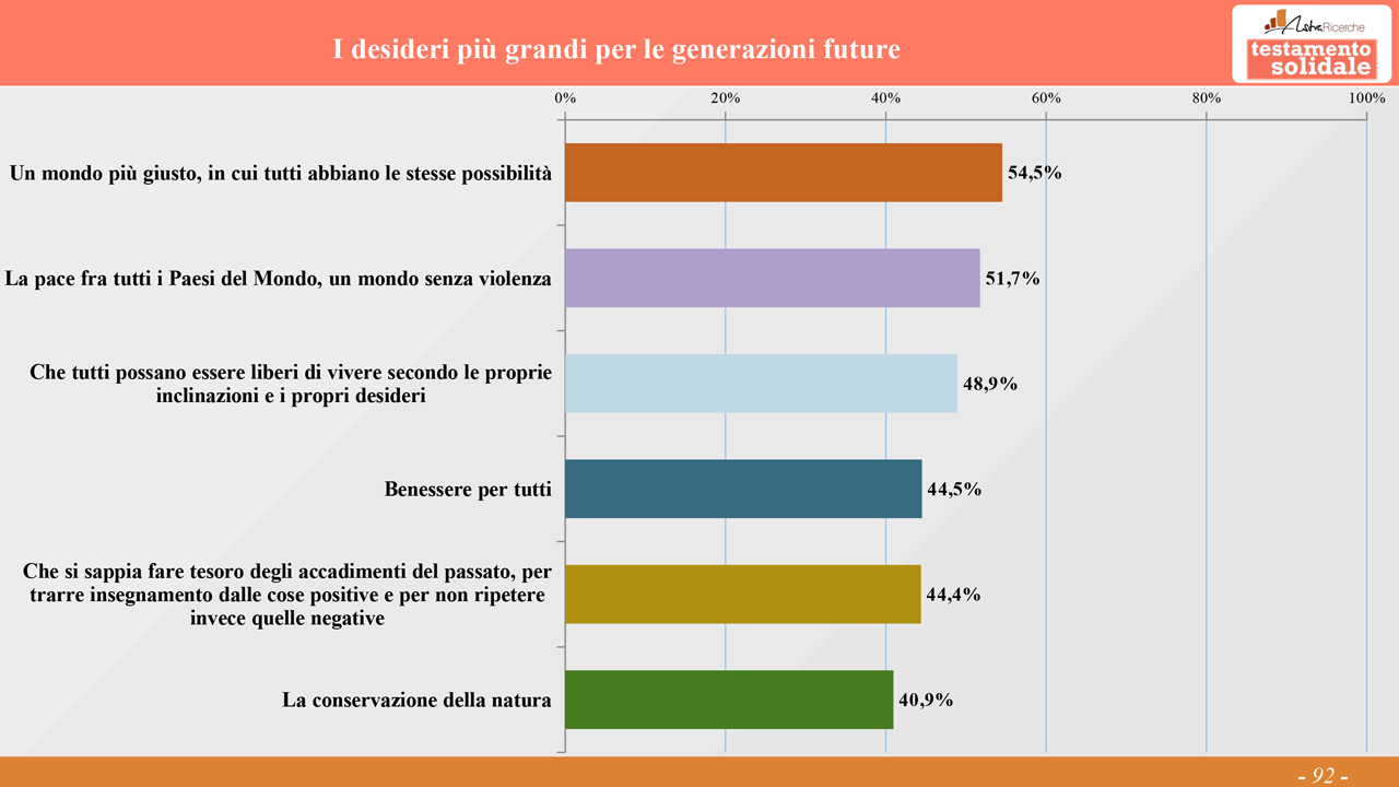 Tra gli auspici per il futuro, il più indicato (in una logica di risposta multipla) è un mondo più giusto, in cui tutti abbiano le stesse possibilità (54.5%), seguito dalla pace fra tutti i Paesi del mondo (51.8%). Ma quando viene chiesto di fare una scelta singola indicando il desiderio in assoluto più grande, la classifica cambia, quello nettamente più indicato è la pace fra tutti i Paesi del mondo (27.6%), che cresce dal 13% dei 25-34enni fino al 37% dei 55-70enni.